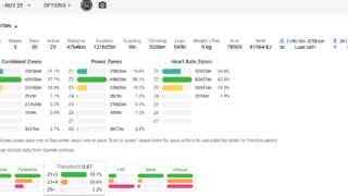 Z1:~110、Z2:~130、Z3:~150、Z4:~166、Z5:~180としました。Z5だけ中途半端なのは予備心拍の9割以上にしたかったからです。今月はゼロ。まるで追い込んでいないことがわかります。笑