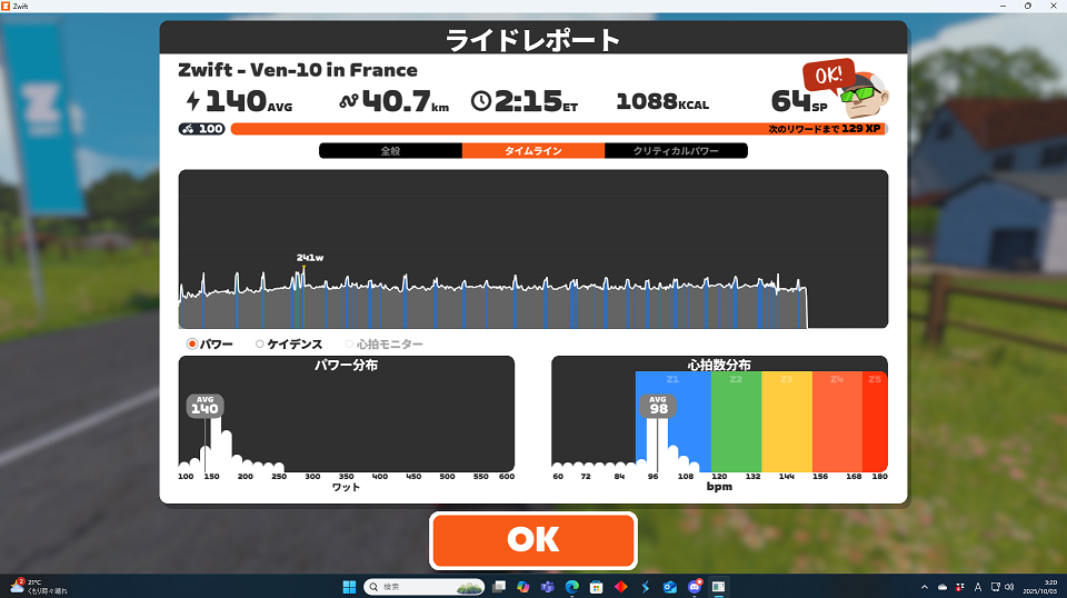 心拍計の接続切るとそこからの心拍は(分布、平均に)反映されないんだね。0扱いになるわけじゃないのか。