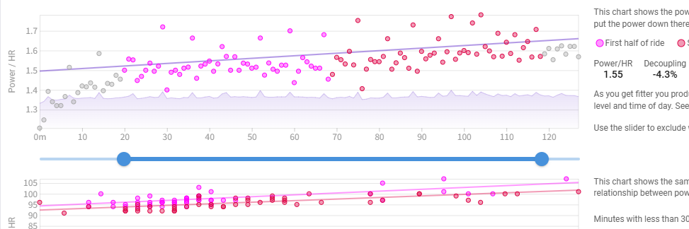 心拍は思ったより落ち着いていたけど、やっぱり疲れているときの推移。(身体が温まっていない)最初の20分を除いてもどんどんP/Hrが良化するというやつ。だんだん落ち着いてくる。