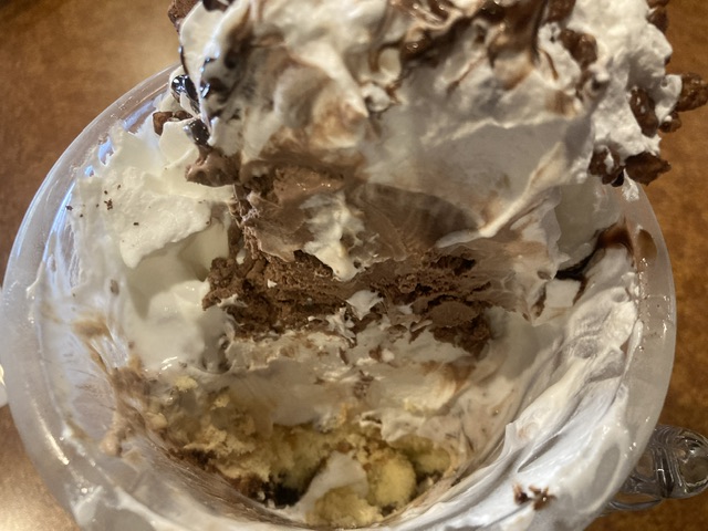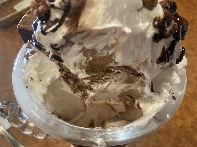 に、チョコシロップがかかっていて、周りをブラウニー的なもので囲われています。クリームの海に溺れるwww