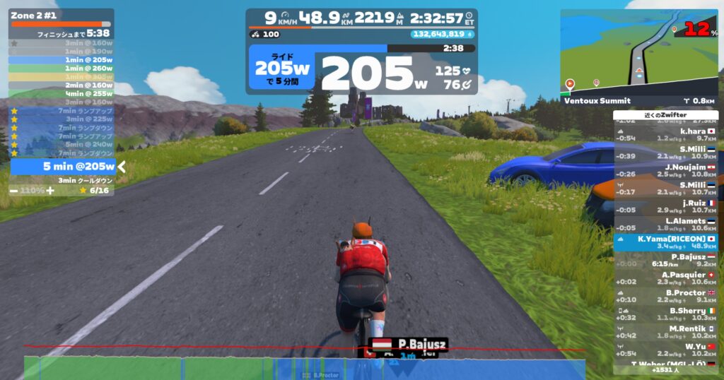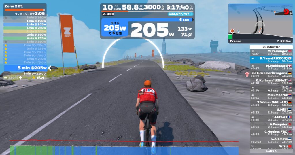 下って2本目。ワークアウトで。190~240Wを行ったり来たり。