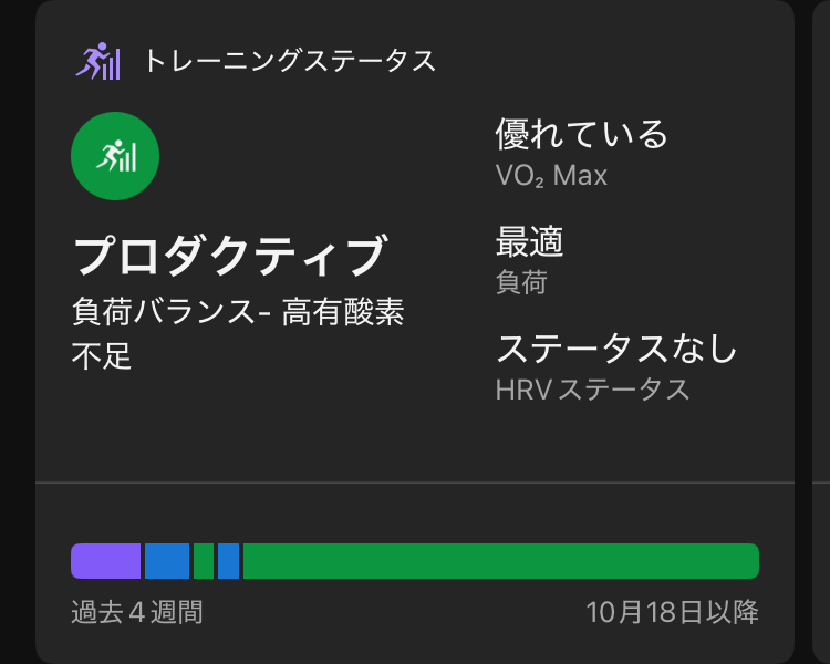 涼しくなったことはトレーニングそのものより仕事の疲労が小さくなったのがかなり大きいです。マジで高温多湿灼熱地獄は悪。