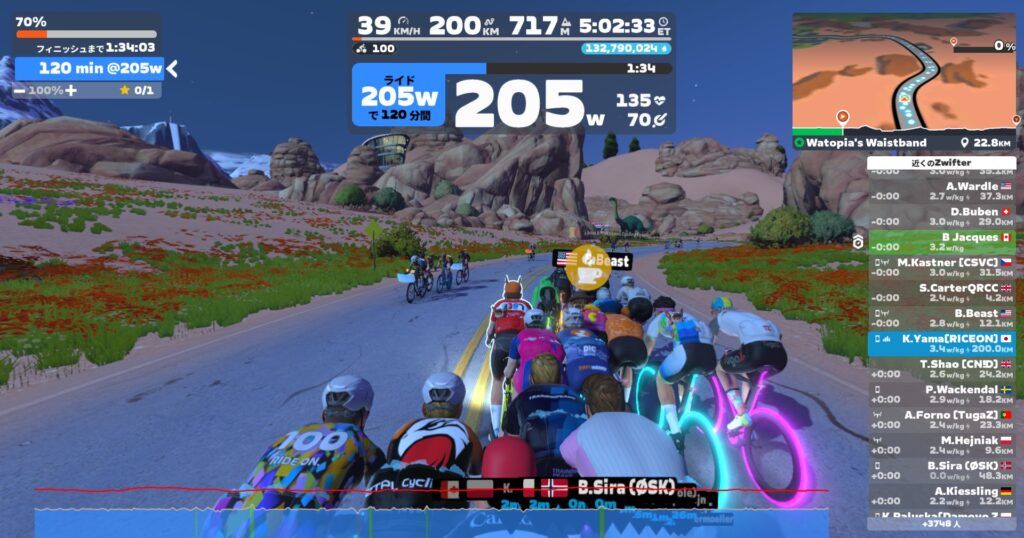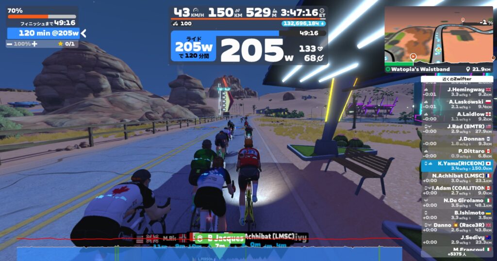 150km。序盤は115ぐらいだった心拍も130を切らなくなってきた。ちゃんと補給しているので体感的には割とラクだけど。