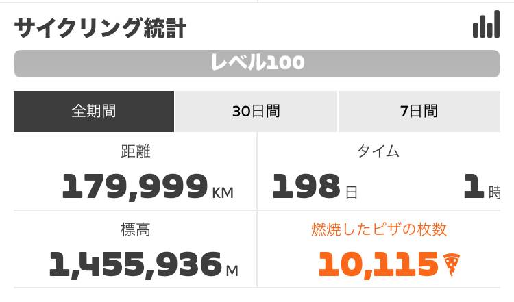 Zwiftのピザは1枚285kcalらしいので、288万kcalを消費したことになるようですw一般成人男性3年分に近いぐらいのカロリーですねwww