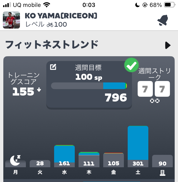 この食あたりがレスト週の直後に来てしまったのもタイミングが悪かったですね。結果的には2週連続レスト週みたいな感じになりました。TSSが3桁とか久しぶりですね。笑