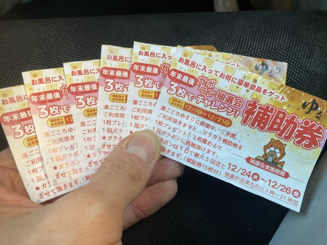 仕事納めで15時半ぐらいに終わったのでガチャを引きに銭湯へ。2回分の券を持っているので。このガチャ12/24~26しか引けないとかなかなかひどくない?w平日オンリーとかやめーやw