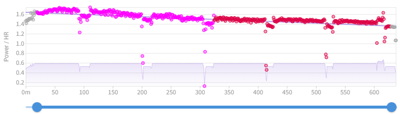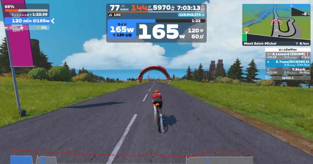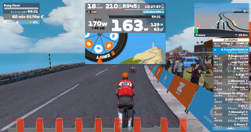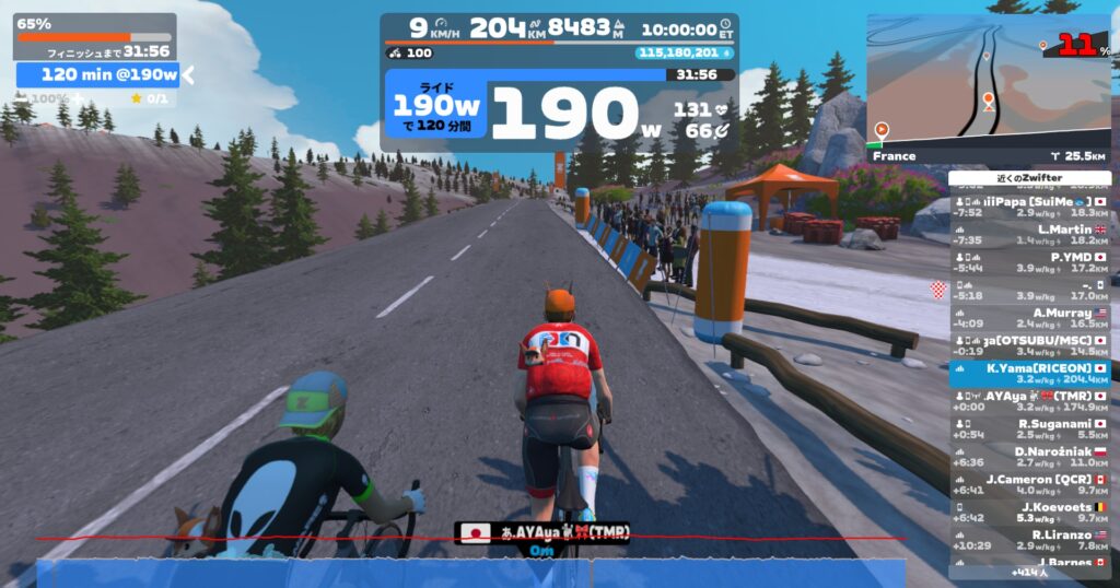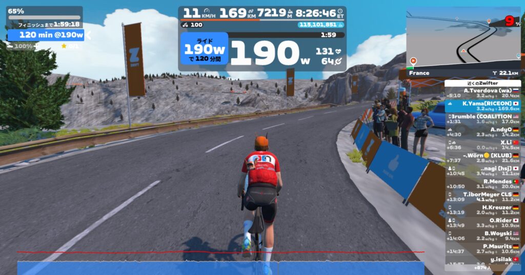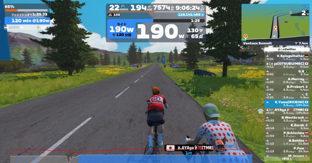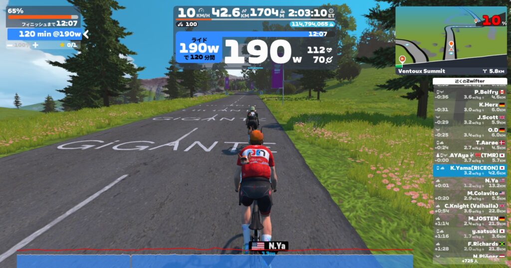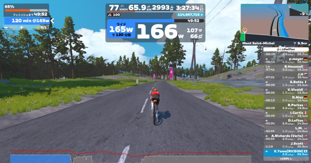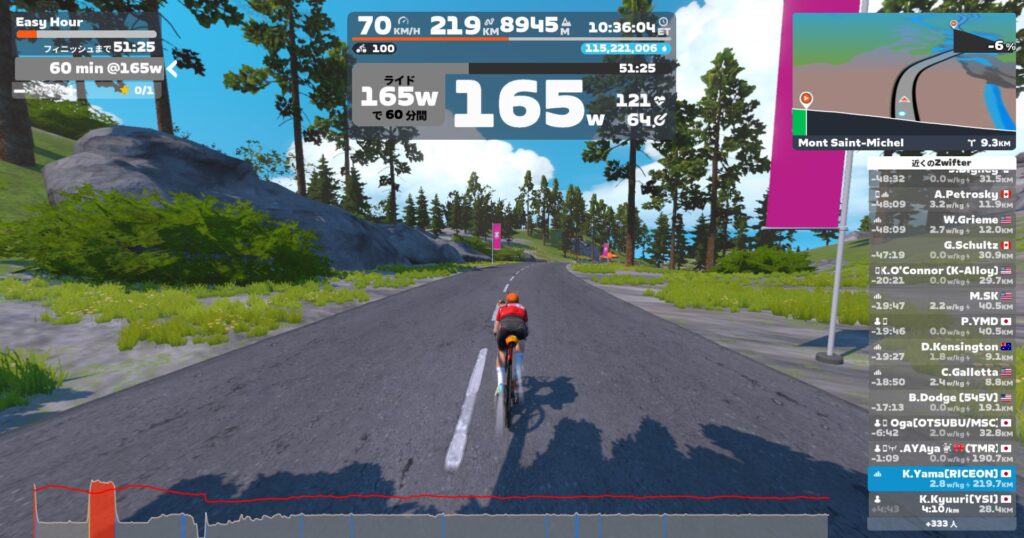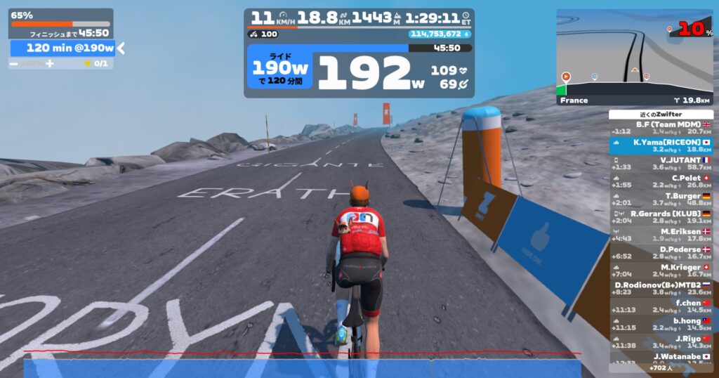 走りの方は、最初から最後まで全く同じペースでいい感じに走り切れましたね。登りはひたすら190W。下りはひたすら165W。