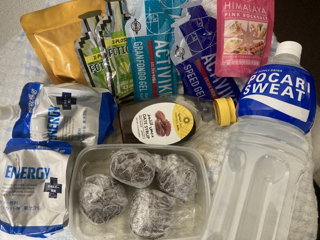 おはぎ5個(330)、スピードジェル3個(80)、ゼリー2個(90)、干し芋2袋(80)、ポカリ(60)、黒糖ドリンク(30)、塩。