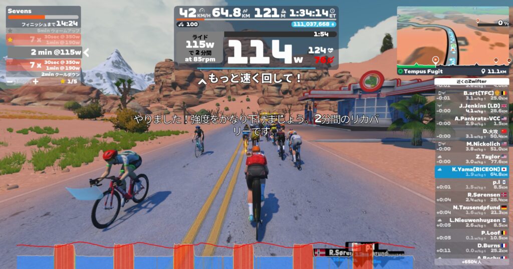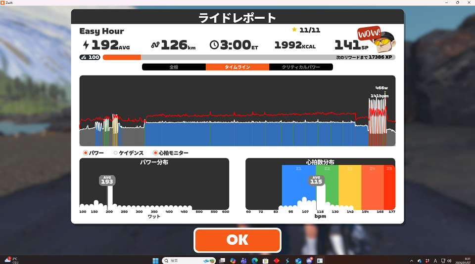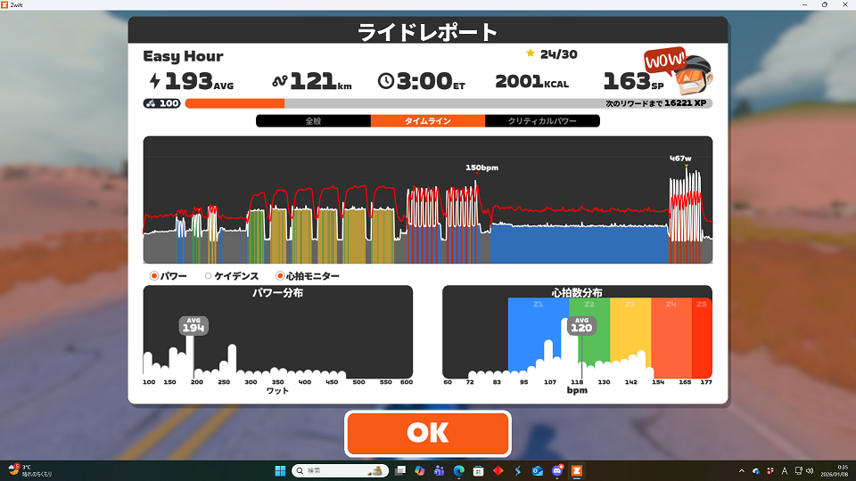 思ったより元気というか、昨日より心拍低いんじゃない?って感じ。クリスクロスは結構ダメージになるかと思ったが。