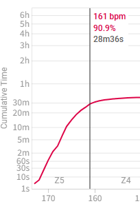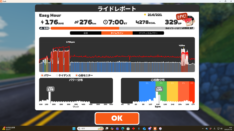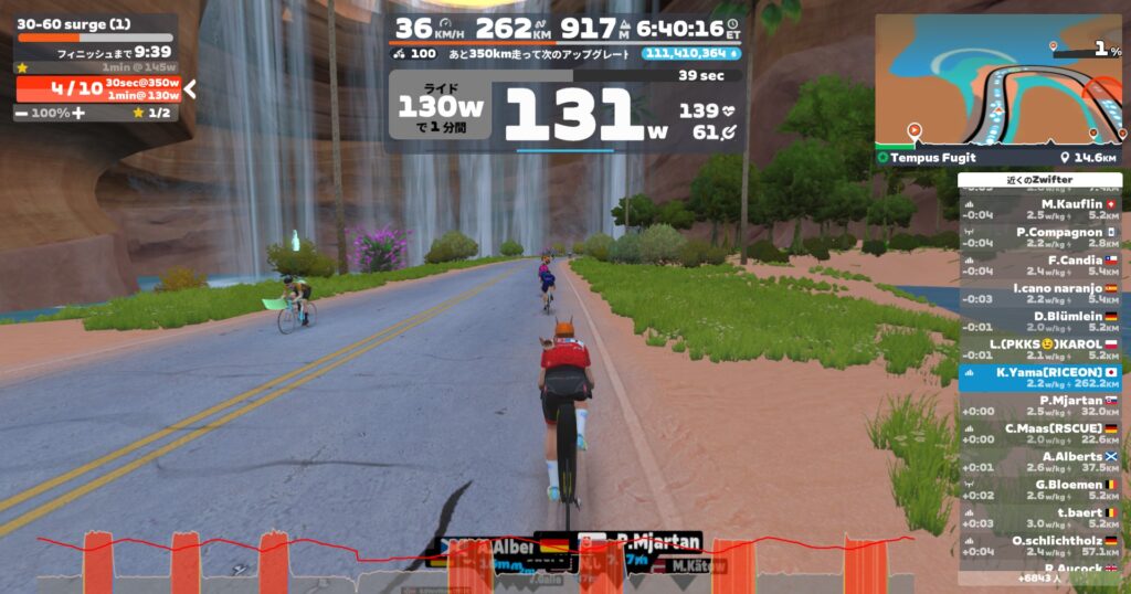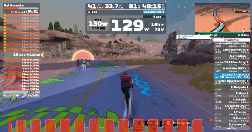最初の1min(405W)で前回は心拍170までいったけど今日は165止まりで、おっ?ってなった。