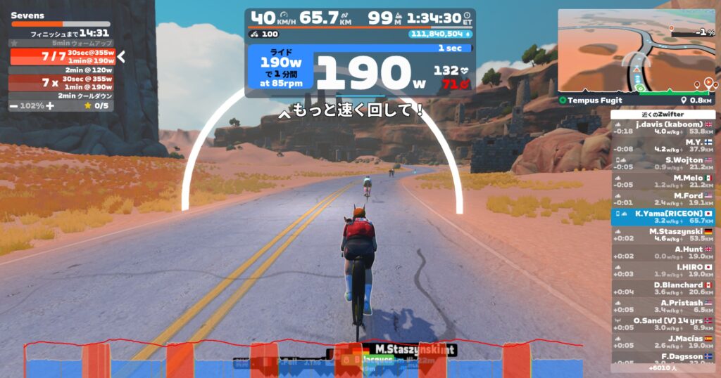 205Wでいこうと思っていたけど結構疲労が残っている感じだったので10minで切り上げて190Wに下げた。変に意地張るとひきずるので無理しない。