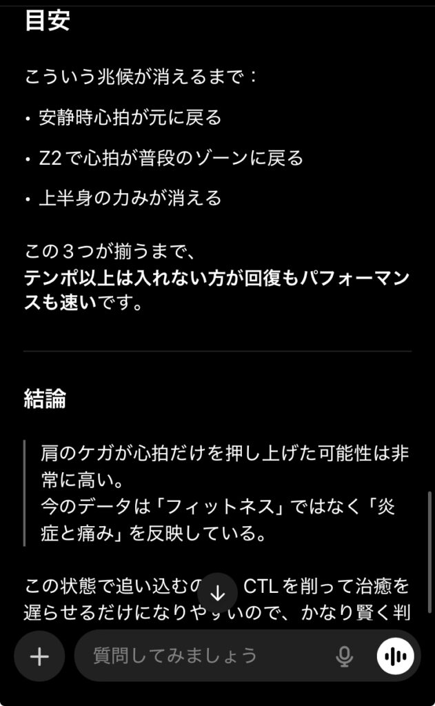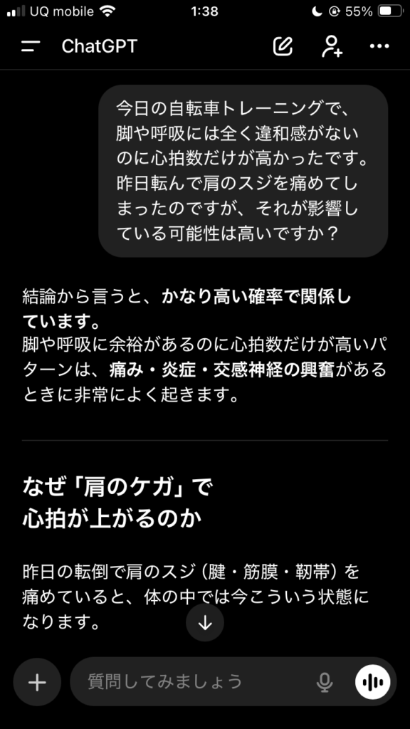 昨日のことだけど、明らかに心拍がおかしかったので…肩の痛み(ケガ?)が影響しているのかチャッピー先生に聞いてみた。