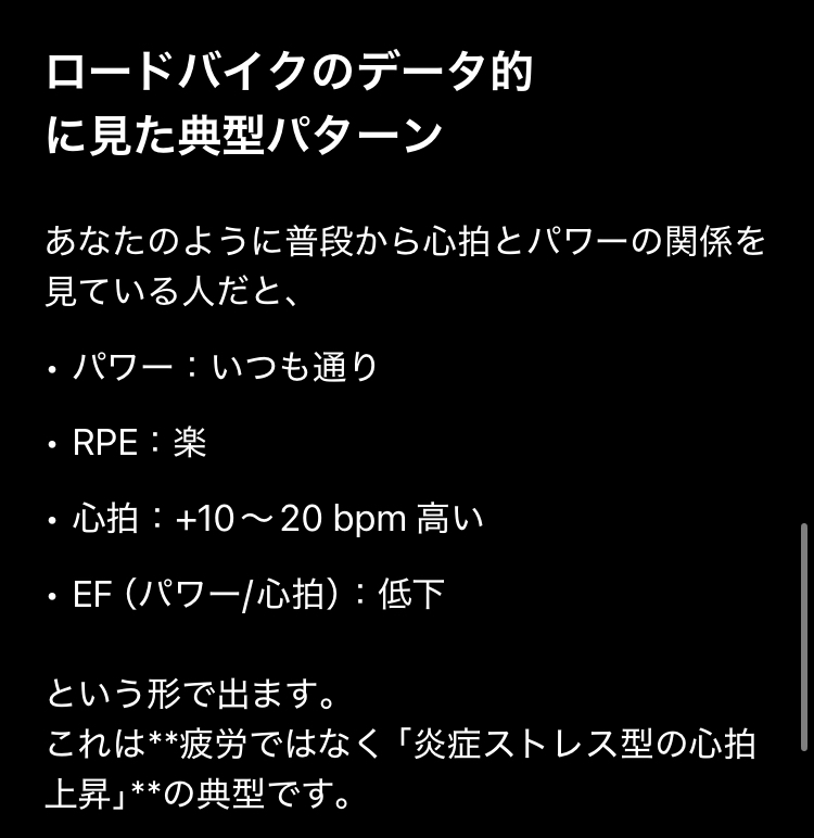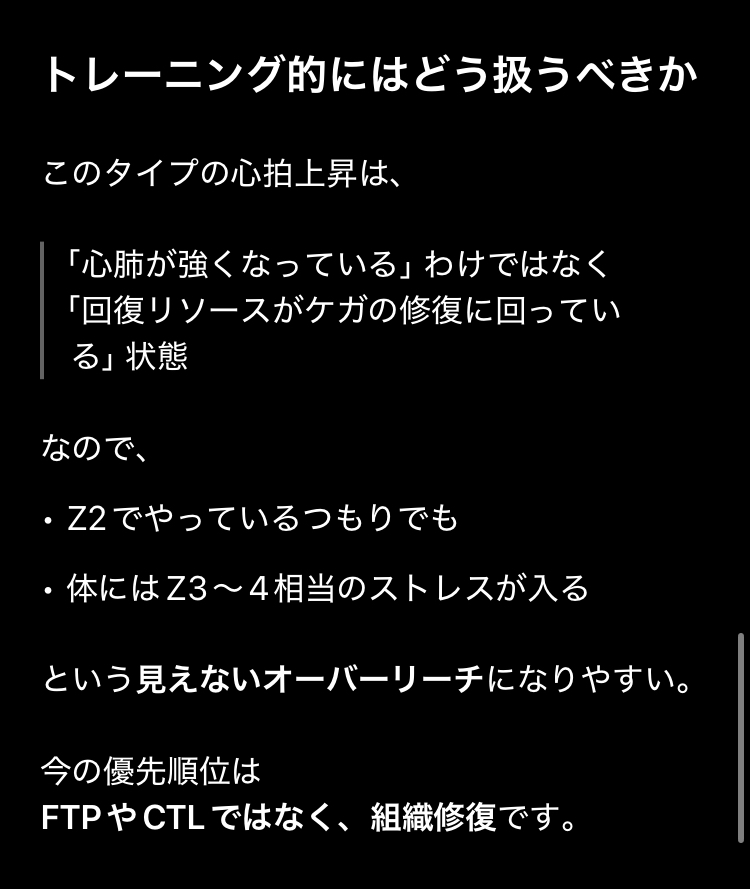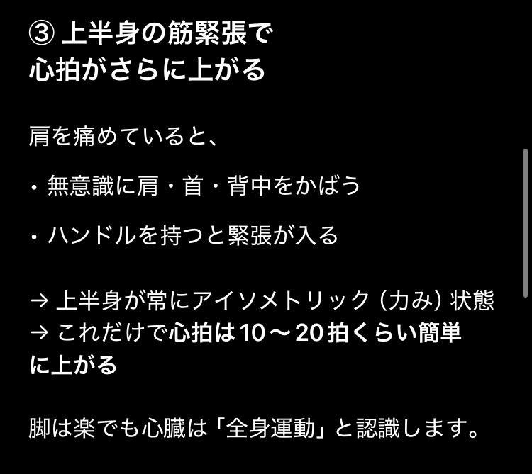 はい、ということで昨日の現象はやっぱり肩のやらかしが大きく影響していたということでよさそうです。実際、低強度帯でも心拍が10…かそれ以上は違う感じでした。骨折のような大きなケガではないのにそんなに変わるんかい。