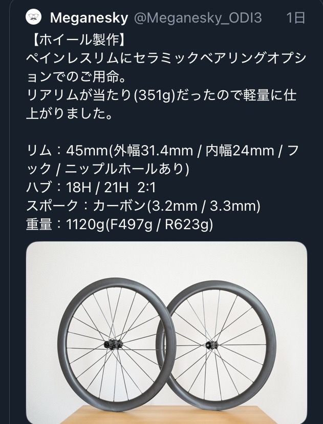 また、今回はリアのリムが「当たり」で軽かったようですが、その辺が本当に進む方向に「当たり」なのかまではわかりません。ただ、ハブはこのときよりもよく回るもの(Meganeskyさん談)を入れてくださったとのこと。