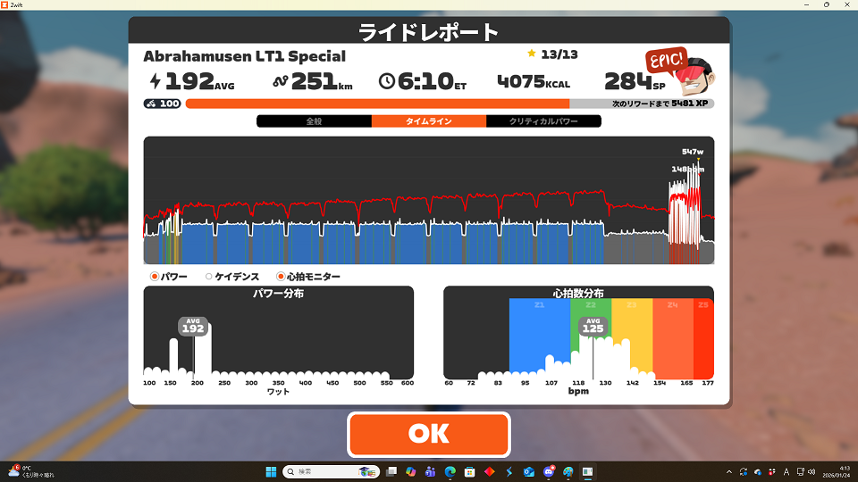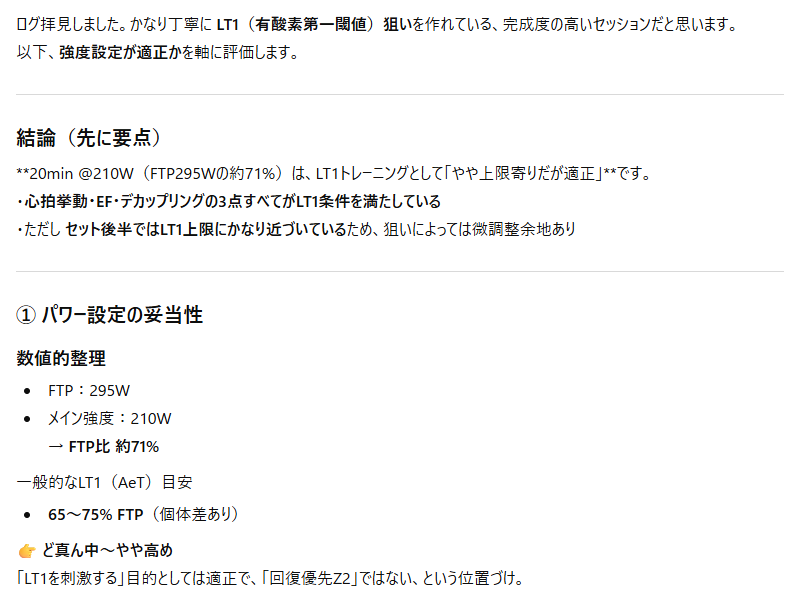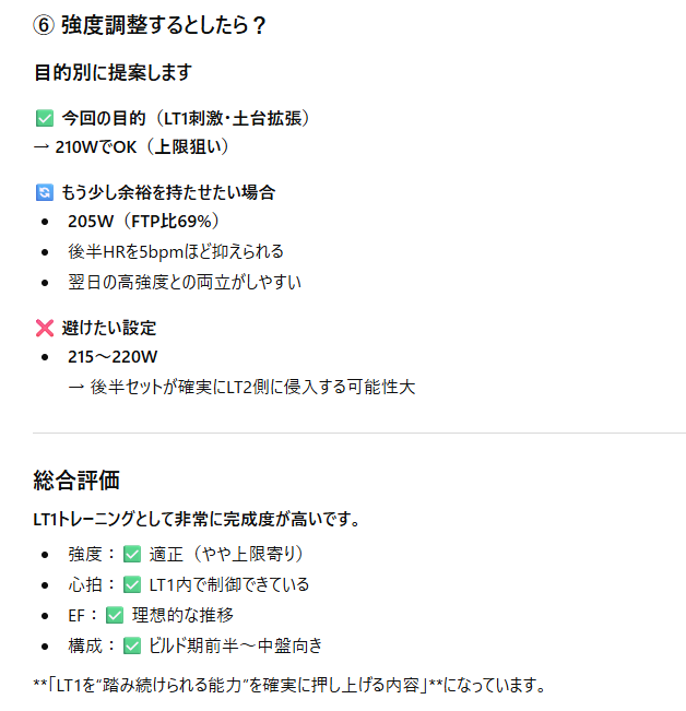 ということで一般サイクリストである私は私の強度で行う。70%とかが適正なんじゃないかな。テンポまでいったらやりすぎ感ある。LT1トレはLT1を超えないようにするのが肝要である。疲れてくる終盤は設定を下げてもいい。気楽にいこう。