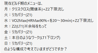 こんな感じで考えています。6日ローテはやめて、7日ローテで。高強度は週2まででSST系はカット。VO2Maxの後に中1日でポイント練をやらないようにするため、クリスクロスとVO2Maxの順番を入れ替え。