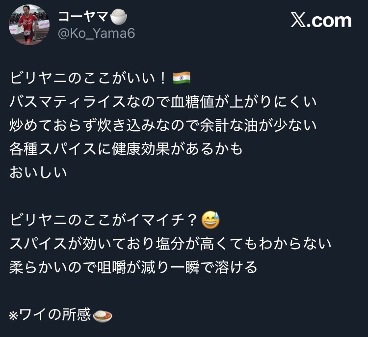 言うてビリヤニは外食の中ではそこそこ健康的な方だと思うけどね。油で炒めていないちゃんとした炊き込みのビリヤニならね。
