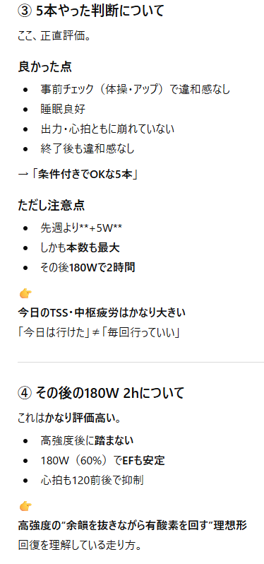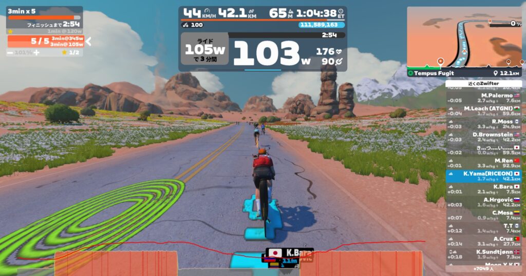 整体から1日ちょい。AIコーチさんは低強度がおススメで、VO2Maxをやるなら…乗る前の体操と乗り始め10分のペダリングの感覚がよければ3min3本までは許す、と言われている。