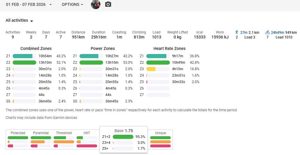 月曜のクリスクロスが負荷が大きいようです。20min×2って結構なボリュームみたいなんですよね。実際、閾値付近+解糖系、乳酸クリアランス強化と疲労要素が多く、高心拍(90~95%)も結構な時間維持していて、ガーミンの評価なんかはVO2Maxになるぐらいです。