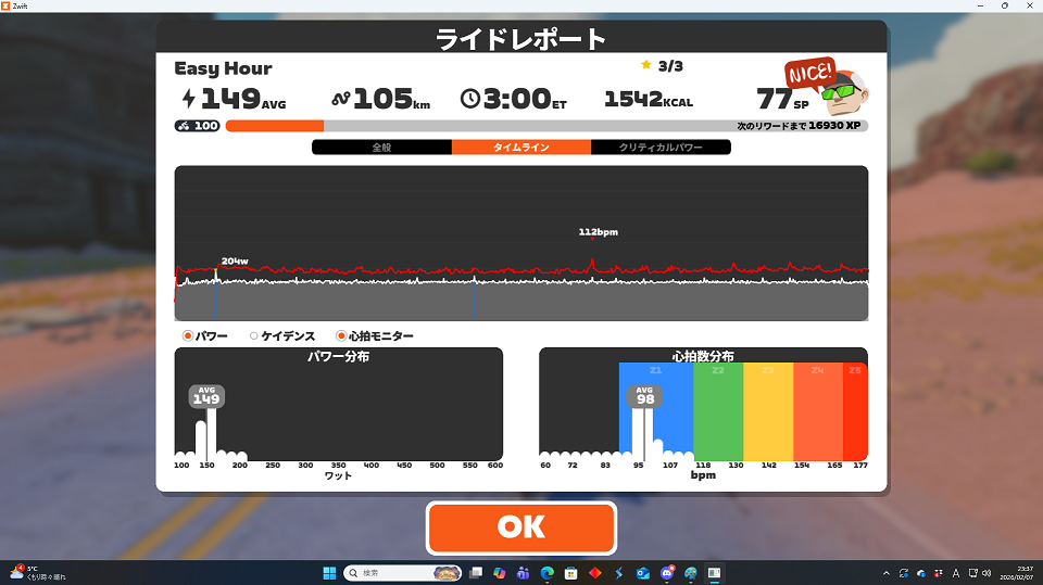 あと、高強度の後って…意外とちゃんと眠れているんですよね。おそらく高強度メニューが終わった後に結構長めに低強度で回しているのがいいんだと思います。神経がしっかり整ってから降りているので割と寝られるということなんじゃないでしょうか。多分。