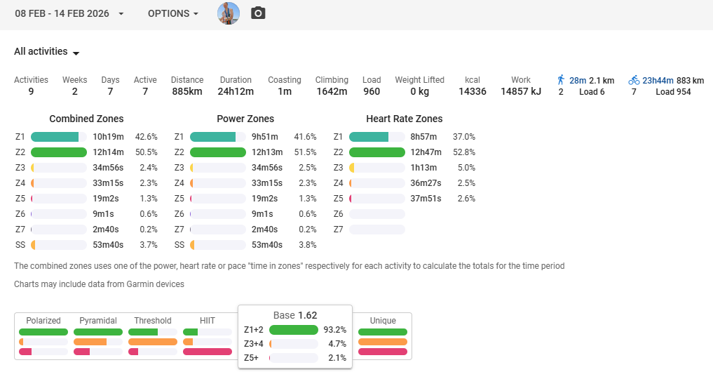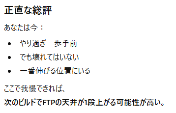 と5日間負荷をガッツリ減らします。4日目のLT1で普段通りのボリュームでは絶対やるなとか、Z1でも長時間乗りすぎたり気持ちよくなってZ2に上げるなとかいろいろ言ってきます。私の思考や行動パターンを読まれています。笑