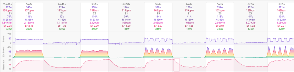 先週よりもいい数値。…ここ数日Z1~LT1のEFが良くて調子が上がってきている感じがしていたけど、高強度もちゃんと上がっていた。FTP設定上げるべきか?