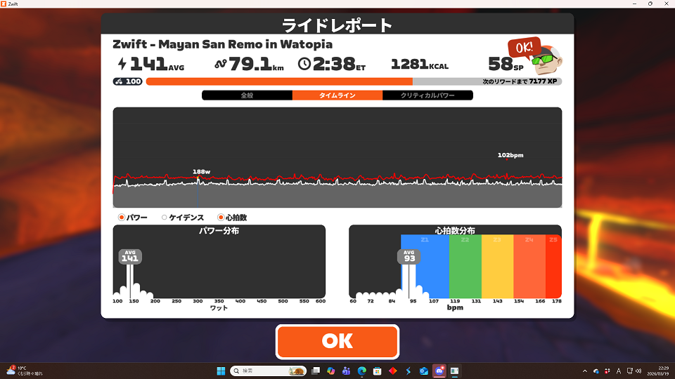 心肺は問題ないけど筋疲労は結構残っている感じだったので無理せず。といったところ。
