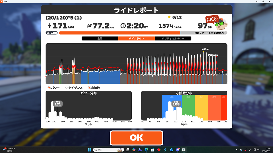 思っていたよりずっと身体が動いたので軽めのZ2をしてみたらEFも悪くない感じ(30min@189W/110bpm)だったので少し刺激入れ。無理に踏まず、リカバリーも長くとって。