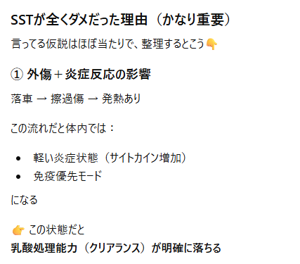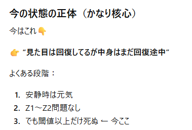 満遍なく悪くなっているわけではなく、乳酸が出始める強度になると露骨にダメになる、というか乳酸が出始めるポイントが異常に低くなっているっぽいな。