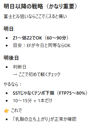 とりあえず明日も低強度。明後日はテンポ下限か、そこからビルドアップして確認していく感じにしていこうか。