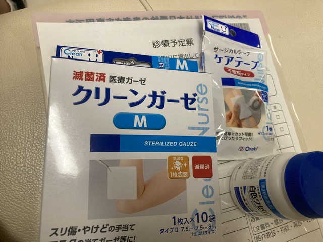 病院内のファミマにはちゃんとガーゼとテープが売られていました。さすがやで。ミニワセリンは自前です。実走用な。笑