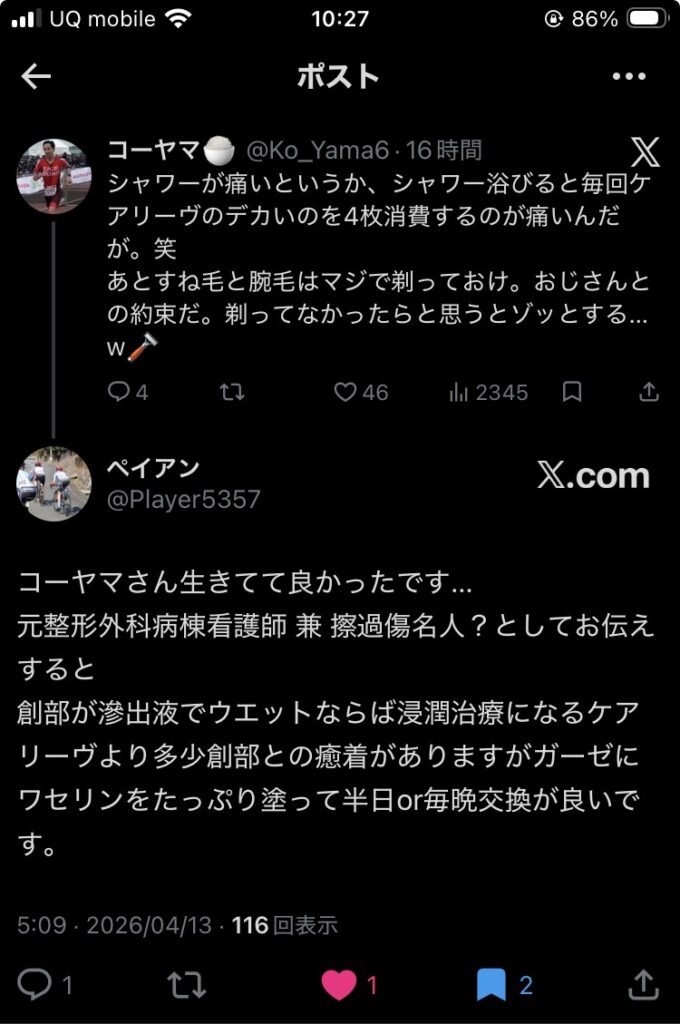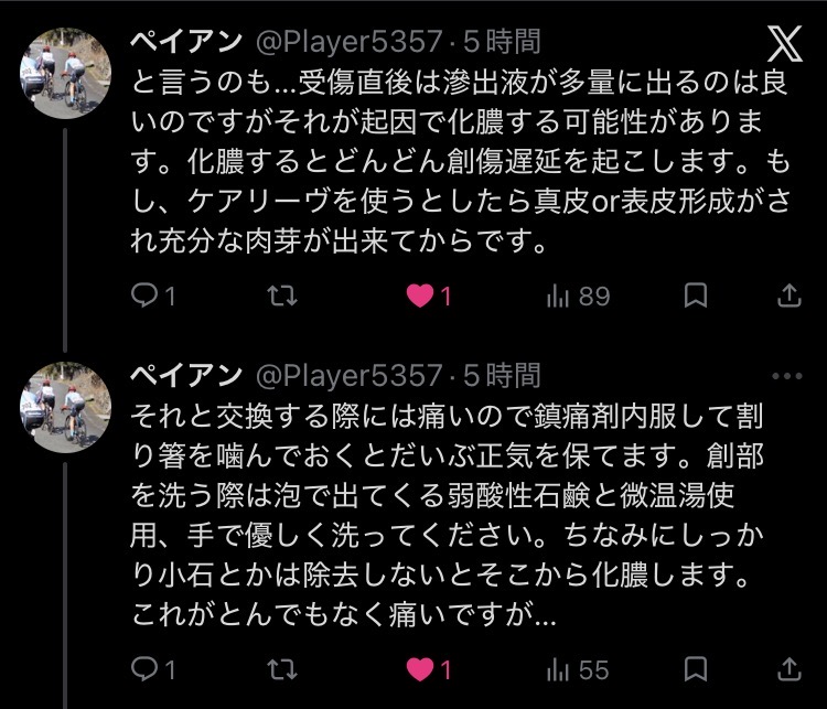 ペイアンさんマジで擦過傷名人じゃん!ホントありがとうございます!さすが看護師!ま~~~た仲間に助けられてしまったぜ…wそういえば土曜に救急で受けた処置もこれだったわぁ…w