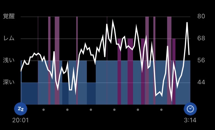 枕を使わずに(首の隙間は埋めて)寝るというのを試してみたがこれが失敗。熟睡できず首が痛くなりそうな気配もあった。序盤に覚醒してしまっているのはそのせいで、HRVも低め。多分3回目の長めの覚醒の後に枕アリに切り替えてる。1時過ぎぐらいにトイレ。
