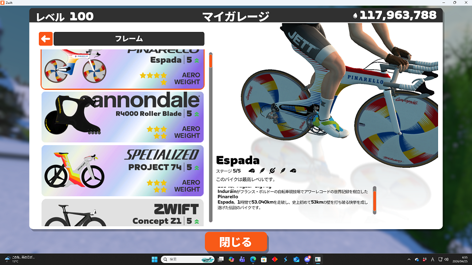 こいつらはレベル5にするのに8000km×3+200時間必要なので計800時間強はかかったはず。それに加えてスペシャ、ピナレロ、キャノンデール、Zwiftブランドを3種類ずつ育てておく必要がある。効率的にやっても多分1200時間ぐらいはかかるかな。