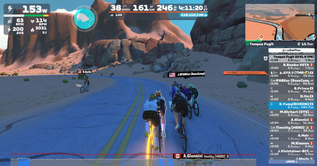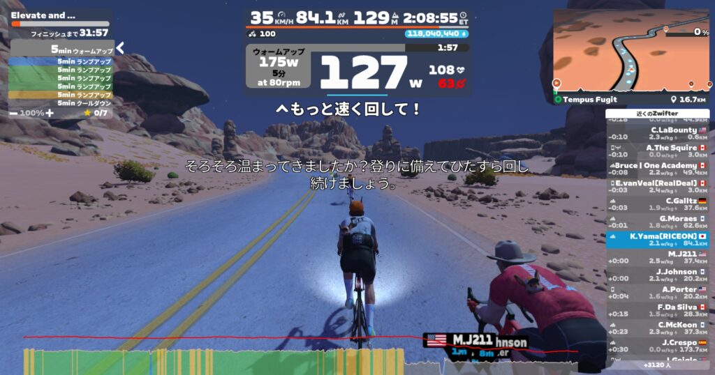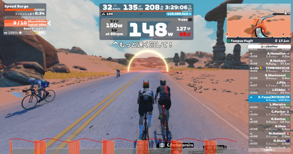 高強度メニューで乳酸をドバドバ出したらそれをエネルギーにするべくエンデュランス走をやっておきます。これは好きなメニューです。笑